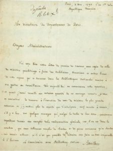 Commissaire aux Bibliothèques nationales, il a bien reçu la copie des ordres du ministre sur le « triage à faire des nobiliaires, armoriaux et autres livres de cette espèce qui se trouvent dans les Bibliothèques nationales remises à ma garde ou surveillance. Dès aujourd'hui on commencera cette opération, et quand j'aurai recueilli une certaine quantité de ces ouvrages proscrits, je vous préviendrai ». Il exécutera les vœux du ministre avec le plus grand zèle : « j'y mettrai plus de sévérité que d'indulgence, sauf ensuite à revenir, s'il y a lieu, sur quelques ouvrages qui, malgré la tache de leur titre, paroitroient cependant être exceptés de la condamnation générale, car il en est dans le nombre, qui sont tellement remplis de chartes et de pièces anciennes qu'on chercheroit en vain ailleurs, qu'il n'est pas possible de les détruire sans faire un tort irréparable à l'histoire »...