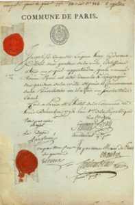 La pièce porte les signatures d'Antoine-Joseph SANTERRE (1752-1809) commandant général de la Garde Nationale, Augustin-Eugène HAY et LANGLUMÉ colonel et major des Gardes de la ville, et Claude COULOMBEAU secrétaire-greffier de la Commune...