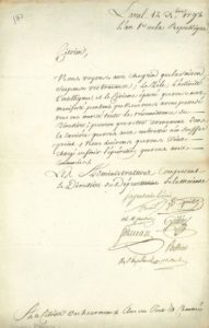 « Nous voyons avec chagrin que la saison suspend vos travaux ; le zèle, l'activité, l'intelligence et le civisme épuré que vous avez manifesté pendant que nous vous avons possédé vous ont mérité toute la reconnaissance du Directoire »…Ils le félicitent pour le bon travail effectué. La pièce est signée par François Serveau, et par 6 autres membres : Ch. M. Jourdain, Géhérel, Pottier, Segrétain l'aîné, etc.