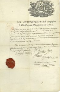 Jean-Baptiste COFFINHAL (1762-1794) juge puis vice-président du Tribunal révolutionnaire, il se montra impitoyable ; arrêté après le 9 thermidor, il fut guillotiné. P.S., Aurillac 4 février 1793 ; 1 page in-fol., vignette Département du Cantal avec bonnet phrygien collé à la place des armes découpées en-tête Les Administrateurs composant le Directoire du Département du Cantal, sceau de cire rouge (écrasé).