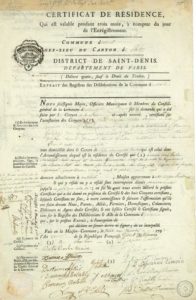 Visa donné comme membre du Directoire du Département de Paris à un certificat de résidence au nom d'Antoine-César Praslin, « MaIl s'agit réchal des camps et armées françoises », demeurant à Auteuil… Signatures du maire et de nombreux notables et témoins. [Il s'agit du général et homme politique Antoine-César de CHOISEUL-PRASLIN (1756-1808).]