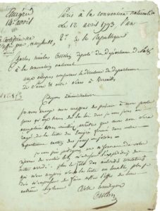 Charles-Nicolas OSSELIN (1752-1794) conventionnel (Paris) ; condamné à la déportation pour avoir fait sortir de prison une émigrée dont il était épris, accusé d'avoir participé à la conspiration des prisons, il tenta de se suicider avec un clou et fut guillotiné: L.A.S., Paris à la Convention nationale 12 avril 1793, aux citoyens composant le directoire du département de Seine & Oise ; 1 page in-4.