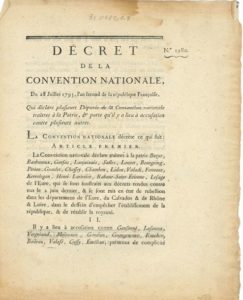5 Décrets de la Convention nationale : 31 mai, Qui supprime la Commission de Douze ; fixe au 10 août prochain, une Fédération générale & républicains, & détermine les mesures à prendre pour la sûreté des personnes & des propriétés, & le maintien de la tranquillité publique ; 2 juin, Qui met en arrestation différens Membres de la Convention nationale (2 ex. dont un relié) ; 28 juillet, Qui déclare plusieurs Députés de la Convention nationale traîtres à la Patrie, & porte qu'il y a lieu à accusation contre plusieurs autres ; 3 octobre, Qui traduit plusieurs de ses Membres devant le Tribunal révolutionnaire, & en met d'autres en état d'arrestation.