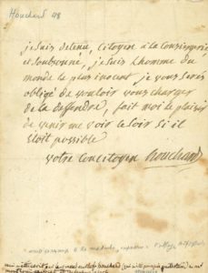 « Je suis détenu […] à la conciergerie et soubsonné, je suis l'homme du monde le plus inocent je vous serés obligé de vouloir vous charger de la deffendre, fait moi plaisir de venir me voir ce soir si il étoit possible »…