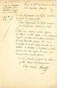 Jean-Marie COLLOT D'HERBOIS (1749-1796) comédien et auteur dramatique, conventionnel (Paris), fougueux Montagnard, membre du Comité de Salut public, il réprima violemment l'insurrection de Lyon et fut un des principaux acteurs de la chute de Robespierre ; condamné à la déportation en Guyane où il mourut. L.S., cosignée par Hérault de Séchelles, Paris le 26edu 1er mois de l'an 2 de la République française (17 octobre 1793), aux Représentants du Peuple envoyés par la Convention nationale à Brest ; 1 page in-fol.