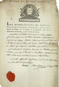 COMMUNE AFFRANCHIE. P.S. par Antoine-Louis ALBITTE, Jean-Marie COLLOT d'HERBOIS, Joseph FOUCHÉ et Sébastien LA PORTE, « Ville-affranchie » [Lyon] 17 frimaire II (7 décembre 1793) ; 1 page grand in-fol. à en-tête Les Représentans du Peuple, envoyés dans la Commune-Affranchie, pour y assurer le bonheur du Peuple avec le triomphe de la République..., vignette, sceau de cire rouge, (fentes réparées au scotch).