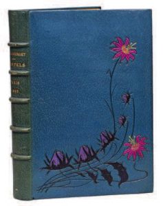 Paul Bourget. Pastels. Dix portraits de femmes. Paris, Conquet, 1895. Grand in-8, maroquin bleuet, chardons et fleurs des champs mosaïqués sur le premier plat, dos à 5 nerfs, encadrement intérieur avec fleurs mosaïquées et filets dorés,