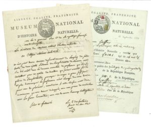 muséum. L.A.S. et P.S., Paris 2 germinal et 29 fructidor II (22 mars et 15 septembre 1794) ; 1 page in-4 chaque, la seconde en partie impr., vignettes et en-têtes du Muséum national d'histoire naturelle, une adresse.