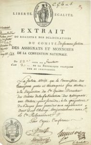 22 fructidor II (8 septembre 1794), à en-tête et cachet encre du Comité des Assignats et Monnoies. Mise à disposition d'une voiture pour le citoyen Guillot « Directeur des artistes de la fabrication des assignats, […] pour se rendre à la papeterie de Buges pour procéder aux expériences dont il est chargé conjointement avec le Cn Ribeaucourt ». Ont signé : L. Cochet, P.F. Giraud, S. Humbert, L. Servière.