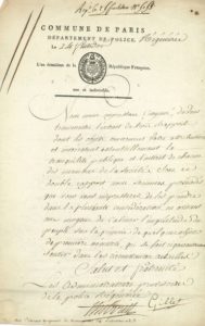 COMMUNE DE PARIS. 3 P.S. ou L.S. par THIBOUST et GILLET, administrateurs provisoires de la « Police régénérée », 24 fructidor II (10 septembre 1794), aux citoyens composant la Commission des subsistances ; 5 pages in-fol. ou in-4, en-têtes Commune de Paris, vignettes (liassées par pain à cacheter).