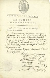 Marie-Joseph CHÉNIER (1764-1811) écrivain et homme politique, conventionnel (Seine-et-Oise). P.A.S., cosignée par 8 membres du Comité de Sûreté générale, Paris 3 prairial III (22 mai 1795) ; 1 page in-fol., vignette et en-tête du Comité de Sûreté générale, sceau sous papier.