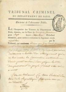 Ordres au Charpentier des travaux du Département de Parisde dresser l'échafaud pour l'exécution de Jean Tinel, serrurier, condamné à mort, « convaincu de s'être mis à la tête d'un attroupement qui a eu lieu contre la Convention nationale et d'avoir porté au bout d'une pique la tête du représentant du peuple feraut [Féraud] »… Le premier document, du 3 prairial, est signé par l'accusateur public Faure. Le second ordre, du 6 prairial, est signé par l'accusateur Roullois. [Le 3 prairial, la foule avait enlevé Tinel pendant son transport vers l'échafaud ; il fallut un nouvel ordre le 6 pour son exécution.]