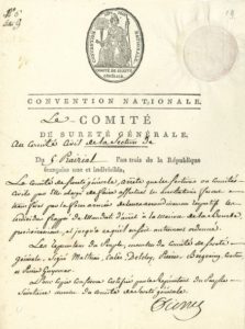 Joseph Nicolas PIERRET(1758-1825)conventionnel (Aube). 2 P.S., 5 et 27 prairial III (24 mai et 15 juin 1795) ; 1 page in-4 et 1 page in-fol., avec vignette et en-tête du Comité de Sûreté générale.