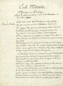Projet d'École militaire :« Légion de 2400 jeunes françois divisée en 8 Bataillons de 300 élèves ». But de l'école : « Cette école a trois objets d'enseignement : l'art militaire, les arts nécessaires aux besoins d'une armée, l'art social »... Ce rapport est divisé en parties : But de l'école ; Élèves pour l'artillerie et le Génie (« Chaque année, quelques élèves qui auront fait le plus de progrès […] se présenteront à l'école Polytechnique ») ; Orphelins et enfans des Défenseurs ; Résultat : « ainsi cette école fournira des soldats qui, à l'amour de la Gloire, à l'habitude de la subordination et d'une discipline austère, joindront une constitution fortifiée par la gymnastique, une pratique suivie des évolutions militaires à pied et à cheval, et les connoissances nécessaires à leur état », etc… Bourdon a jouté à la fin : « Ce plan avoit été adopté par la Commission des 500 (lett. 17 gal an 7) qui se disposoit à en faire le rapport »…