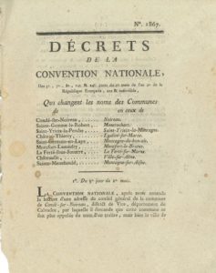 Lettres patentes du Roi en forme d'édit portant sanction des Décrets de l'Assemblée Nationale… (octobre 1789). Loi du 19 janvier 1791sur les Messageries et voitures publiques. Décrets de la Convention nationale (1793-1798) sur Caen et la démolition de son château, le coffre déposé dans le monument à la Bastille, la médaille de la Réunion républicaine du 10 août 1793, le changement de nom des communes, les certificats de civisme, le service des Postes et Messageries, les lettres adressées aux émigrés, le général Custine...