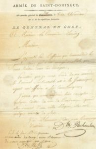 Donatien de ROCHAMBEAU (1755-Leipzig 1815) général de la Révolution et de l'Empire:Donatien. L.S., Q.G. du Cap 3 thermidor XI (22 juillet 1803), au CommodoreLorring, commandant les forces navales britanniques ; 1 page in-fol., en-tête Armée de Saint-Domingue. Le Général en chef, adresse (légères muillures).