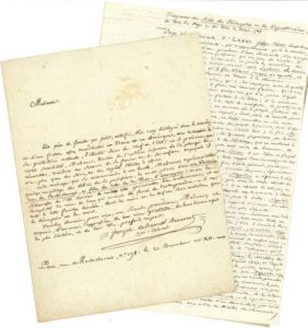 L.A.S., Paris 20 brumaire XII(12 novembre 1803), à « l'illustre sœur du chef de l'état » (1 page in-4). Il décrit « l'extrêmeinfortune où l'a plongé la révolution », avec sa femme et ses enfants.