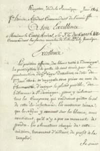 « La position affreuse, des blancs restés à St Domingue, la proscription à laquelle ils sont voués, par la proclamation du Gal nègre Dessalines, en date du 1er janvr 1804, m'engagent à vous prier au nom de l'humanité, d'envoyer le plutôt possible, des bâtimens à St Domingue, pour y réclamer tous les Europeens, qui voudroient quitter le sol de cette île infortunée. Les massacres récens, que les Nègres y exercent sur les blancs, nous avertissent, qu'il n'y a pas un moment à perdre. Les Armateurs chargés de cette mission, trouveront d'ailleurs, du profit à la remplir. Je suis persuadé d'avance, que Votre Excellence, accueillera ma demande, avec la générosité, qui caractérise les grandes ames »…