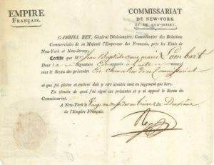 « Général Divisionnaire, Commissaire des relations Commerciales de Sa Majesté l'Empereur des Français, près les États de New-York et de New-Jersey », il certifie que Jean-BaptisteLombart « est Chancelier de ce Commissariat ».