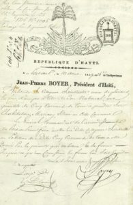 Jean-Pierre BOYER (1772-1851) général de la Révolution et de l'Empire, Président de la République d'Haïti en 1818. P.S., Port-au-Prince 10 août 1819, an 16e de l'Indépendance ; 1 page in-fol., en-tête Jean-Pierre Boyer, Président d'Haïti, vignette tamponnée au palmier, cachet fiscal République d'Hayti.
