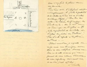 Sur l'emplacement de la guillotine. Il a publié un travail sur l'emplacement de l'échafaud place de la Concorde, mais cet ouvrage est épuisé. Il envoie donc à son ami un petit plandessiné et légendé : « Pour Louis XVI, l'échafaud était à l'emplacement A (entre le piédestal de la statue de Louis XV et l'entrée des Champs-Elysées). Pour tous les autres - la Reine, les Girondins, les Dantonistes - du 8 mai 1793 au 18 juin 1794, on l'a placé en B (entre le piédestal de la statue et l'entrée du jardin des Tuileries). Puis il a été reporté à la place du Trône »…