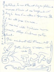 [L'Oie 20 mars 1957](au dos et en marge d'une lettre dactym. à lui adressée par Jean-Louis Garczynski).Il rappelle à Mme Bonnavitacombien elle fut « chic » à la naissance de sa fille Annie, qui à présent « s'initie à la vie morale » dans une ferme-auberge savoyarde. Lui-même s'est rendu une fois dans un salon à Paris qu'il croyait être de l'art rural, mais c'était de l'art mural, sous la présidence du peintre Saint-Maur. « C'était trop nouveau pour moi et mon air emprunté m'a valu d'être mis en boîte […]. Mais un Monsieur présentant bien prit ma défense et se montra si cordial que mon dépaysement tomba du coup et j'expliquais que je comprenais très bien tout cela, que moi-même j'avais fait sensation au village en tapant sur une gamelle en guise de tambourin avant de m'essayer à la peinture. Alors on se montra curieux de voir mes œuvres »… On lui fit de la publicité, ce qui provoqua des commentaires contradictoires à son retour au village, les uns haussant les épaules à son esprit « fantaisiste », les autrrres craignant qu'il fût un mauvais exemple…Vix [9] juillet 1962, à Mlle Bonavita. « Mes dessins semblent plutôt aptes à s'interpréter en tapisseries qu'en broderies mais il se peut que vous pourriez néamoins y trouver des éléments pour votre fabrication. La Vendée éternelle reste assez semblable à elle-même avec son école laïque et son école libre qui gardent chacune de nombreux partisans au point d'y envoyer leurs gosses mais je crois qu'à l'avenir on verra plutôt dans ces écoles de quelconques confréries burlesques »… Précisions sur la distribution des chatons de Zamba… Il aurait aimé acheter la Pichonnière, « mais ma production artistique s'écoule encore que trop lentement »… Le bas de la lettre est occupé par des dessins au stylo bille.