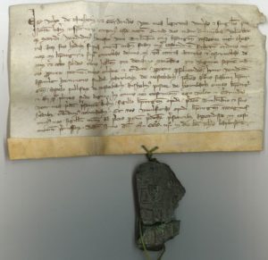 Acte de vente, passé le jour de la fête de Saint Jean-Baptiste, par Volco de Quehem (?) et sa femme Gertrude. Le sceau de cire vert, brisé, représente un château-fort.