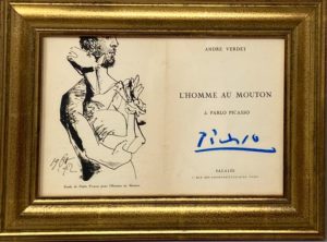 Belle signature « Picasso » au crayon bleu en regard de la reproduction du dessin de Picasso.