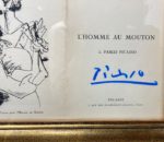 Pablo PICASSO (1881-1973). Signature autographe au crayon bleu sur le prospectus illustré du livre d'André VERDET, L'Homme au mouton, [Falaize, 1950] ; 15 x 23 cm à vue (encadré).