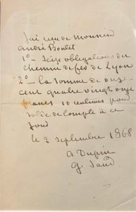 George SAND (1804-1876). P.A.S. « A. Dupin G. Sand », 2 septembre 1868 ; 1 page in-8 …