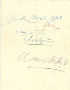 Sur une page, aux crayons bleu, rouge et violet, d'une écriture défaite : « Je ne suis pas fou mais un alcoolique. Maurice Utrillo, V. »