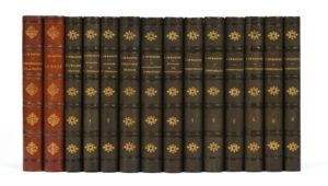 Quatorze volumes in-8, reliures de l'époque en demi-chagrin vert (brun clair pour les deux premiers volumes), plats de percaline verte (aubergine pour les deux premiers volumes) ornée d'encadrements de filets à froid avec supralibris doré au centre, dos à nerfs ornés de filets à froid et d'un fleuron doré dans chaque caisson, tranches mouchetées.