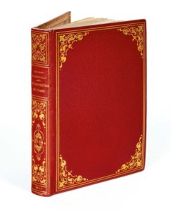 In-16 carré de XXXVI, 160 pp., maroquin rouge, fi lets dorés avec motifs d'angle intérieurs sur les plats, dos lisse orné de fl eurons dorés dans un double encadrement de fi lets, fi lets et roulettes intérieurs, non rogné, couverture vert pâle conservée (Stroobants).
