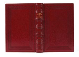 In-12 de (1) f., VIII, 354 pp., (1) f., maroquin bordeaux, multiple encadrement de fi lets à froid sur les plats, dos à nerfs orné de même, non rogné, tranches dorées sur témoins, couverture gris clair et dos conservés, étui (Semet et Plumelle).