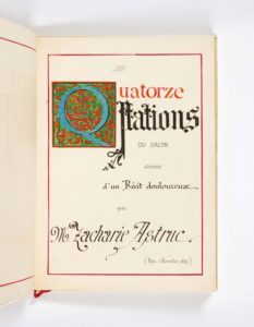 Cette effigie de son maître à penser enthousiasma Bloy au point de lui inspirer un poème en prose, La Méduse-Astruc (les yeux du modèle évoquant pour lui l'animal marin), panégyrique de Barbey, qui fut sa première tentative littéraire. Il en adressa le manuscrit à l'auteur des Diaboliques, qui l'annota, et l'ensemble, superbement calligraphié par Bloy, fut reproduit par un procédé polygraphique à une douzaine d'exemplaires adressés en septembre 1875 à autant de dédicataires, parmi lesquels déjà Mme Astruc. C'est donc deux mois plus tard, qu'ainsi entrés en relations avec le couple Astruc, Bloy adressait à Madame le présent volume, nouvel et double hommage des plus raffinés.