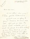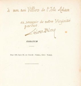 - Le billet autographe de remerciement pour cet envoi, très élogieux, adressé par Villiers à Léon Bloy, une page in-12, daté du 26 avril 1884 : « Je suis ébloui, ému jusqu'à l'âme, pénétré d'admiration... Je vous dirai tout ce que le Christophe Colomb m'a fait de bien et redonné d'humilité, ce dont j'avais soif. Quel livre ! ».