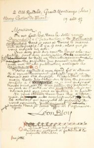 Jointe, montée en tête, la minute autographe corrigée d'une lettre adressée par Bloy à l'avocat belge Henry Carton de Wiart, datée du 19 août 1897 (une page in-8), le prenant à partie à propos du manuscrit de l'Introduction de Belluaires et Porchers.