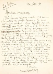 Huysmans, datée lundi 31, une page in-8 : Alors qu'il devait rejoindre Huysmans (au château de Lourps, près de Jutigny, en Seine-et-Marne), il a été retardé et ne pourra partir que mercredi. « Nous aurons 3 jours de la haute vie de château [...]