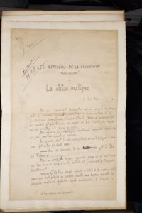 « La statue maligne », poème en prose dédié à Paul Adam a été publié dans La Revue Blanche, n° 26, décembre 1893. [Puis repris dans Les Reposoirs de la procession tome III, Paris, Mercure de France, 1907, et non dans le tome II comme indiqué dans le manuscrit].