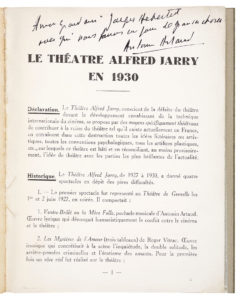 Le Théâtre Alfred Jarry donnera 4 spectacles entre 1927 et 1930. A l'issue de cette tumultueuse aventure et par-delà son échec commercial et public, Vitrac et Artaud décident de publier cette brochure qui est à la fois un bilan, un manifeste et un programme - notamment concernant la mise en scène et la direction des acteurs - afin de relancer l'entreprise et trouver de nouveaux financements.