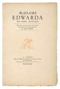 BATAILLE (Georges) sous le pseudonyme de Pierre ANGÉLIQUE. — FAUTRIER (Jean) sous le pseudonyme de Jean PERDU. — Madame Edwarda. — Nouvelle édition revue par l’auteur et enrichie de 30 gravures par Jean Perdu. — Paris, Chez le Solitaire...
