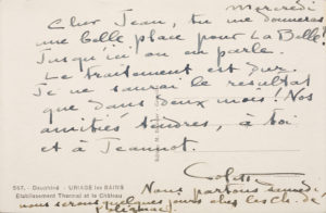 COLETTE. – C.A.S. à Jean COCTEAU. — Uriage les Bains, s.d. (1946) au dos d’une carte postale.