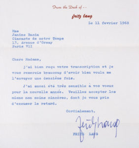 LANG (Fritz). — Lettre signée à Janine Bazin. — 1 p. in-8, 11 février 1968. — En-tête : « From the Desk of… Fritz Lang ».
