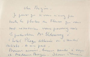 Je pense que si vous n'avez pas toutes les photos du Fleuve qui vous sont nécessaires vous pourriez voir le producteur (…) ou à United Artists de ma part… Sur le tournage de son film Elena et les hommes. (…) Cette entreprise de tourner deux versions m'a terriblement compliqué la vie. Je suis sur le flanc et je ne sais pas comment je m'en tirerai. La vérité est que ce genre de travail doit être possible avec un metteur en scène qui n'écrit pas ses histoires. Je suis trop jaloux pour accepter facilement les scènes conçues par un autre, dans un style qui me semble incompréhensible. Il ignore ce qu'il est advenu de Stella Dassas [l'actrice de Hiroshima mon amour] …