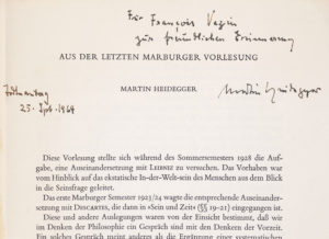 - Was ist Metaphysik? Frankfurt, Klostermann, (1943), in- 8, broché, 31 p. Envoi autographe signé de Heidegger daté de 1946.