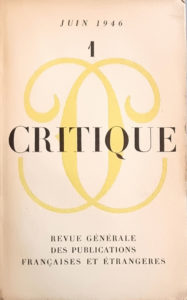 REVUE. CRITIQUE. — Revue générale des publications françaises et étrangères. — Paris, Éditions de Minuit, juin 1946 - décembre 1962, n°1 à 187, soit 171 volumes dont 16 numéros doubles.