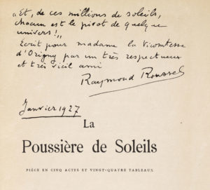 ROUSSEL (Raymond). — La Poussière de Soleils. — Pièce en cinq actes et vingt-quatre tableaux représentée pour la première fois sur la scène du Théâtre de la Porte-Saint-Martin le 2 février 1926. — Paris, Alphonse Lemerre, 1926, in-8...