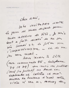 Votre invitation arrive le jour de mon départ pour mon atelier de Sète. Je suis tout à fait désolé de ne pas voir lundi 22 le film sur l’impressionnisme - et de ne pas vous revoir (…) J’ai souvent parlé et pensé à la manière dont vous avez montré mes tableaux à propos du blanc et noir. C’est un exemple de ce qu’on a fait de mieux au cinéma, pour la peinture…