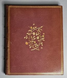 DUMAS (Alexandre). Herminie l Amazone. Paris, Calmann Levy, 1888. In-12 carré, maroquin violet, triple filet, au centre du premier plat branchage de roses mosaïquées, tête dorée, non rogné, dentelle intérieure, couverture (C. Routier). Couverture oxydée et un peu effrangée. Mors supérieur restauré.