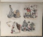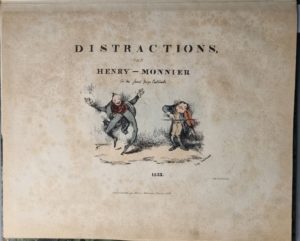 MONNIER (Henry). Ensemble 2 ouvrages. - Esquisses parisiennes. Paris, Imprimerie Delpech, 1827. In-4, bradel percaline Bordeaux (Reliure vers 1900). Couverture illustrée (un peu courte), 10 planches lithographiées et coloriées de l auteur. - Distractions. Paris, chez l auteur, 1832. In-4, bradel demi-percaline verte (Reliure moderne). Suite complète de 9 planches humoristiques en couleurs de Henry Monnier, chacune à plusieurs sujets, planches dépareillées.